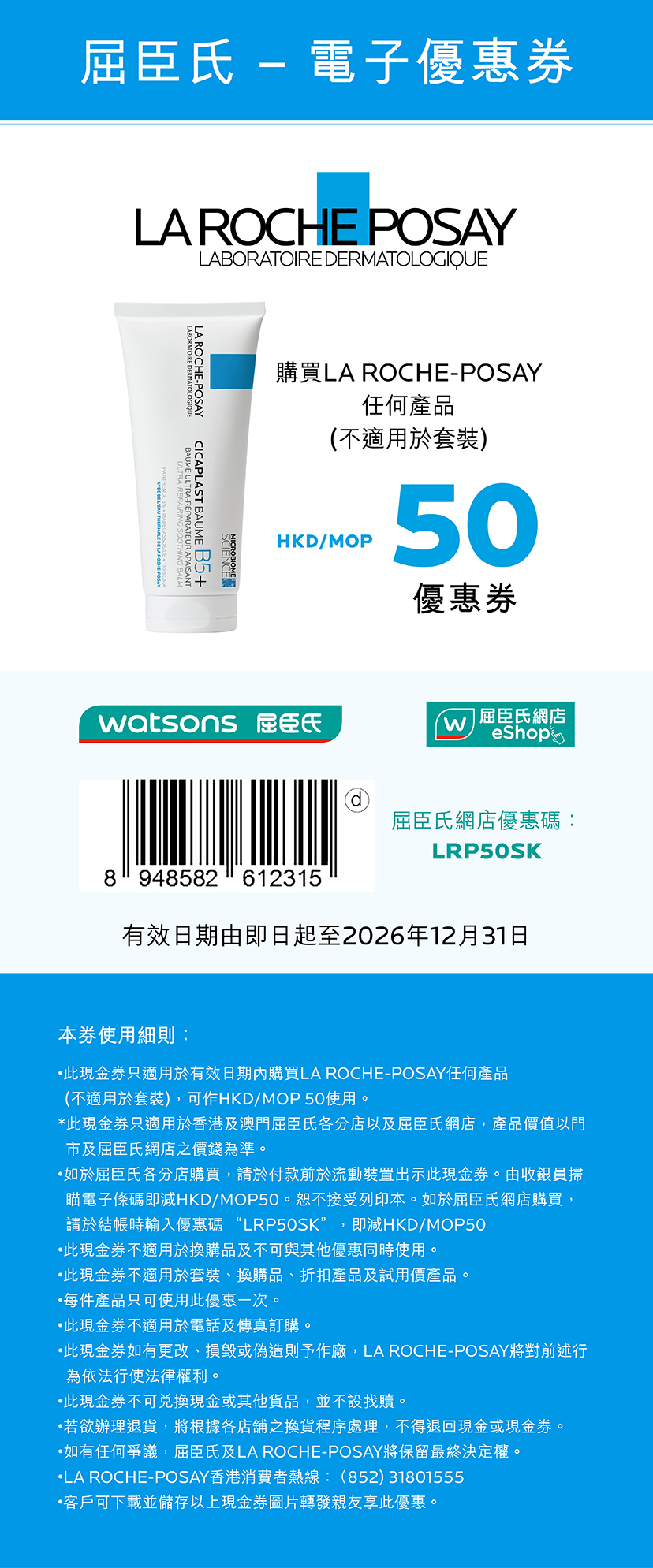 LA ROCHE-POSAY只接受香港及澳門萬寧、香港及澳門屈臣氏、HKTVMALL、指定診所或其他正式零售商之指定產品,合資格產品須附有LRP CLUB官方貼紙。如有同款產品而不附有LRP CLUB官方貼紙, LA ROCHE-POSAY將不接受有關印花紀錄申請。